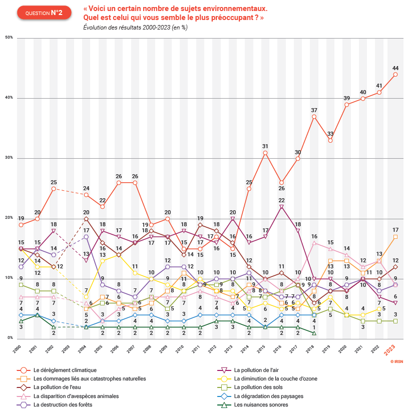 Parmi les principales préoccupations environnementales, le dérèglement climatique (44 %, +3 points) continue d’avancer en tête, loin devant « les dommages liés aux catastrophes naturelles » (17 %, +4 points) et la pollution de l’eau (12 %, +2 points).