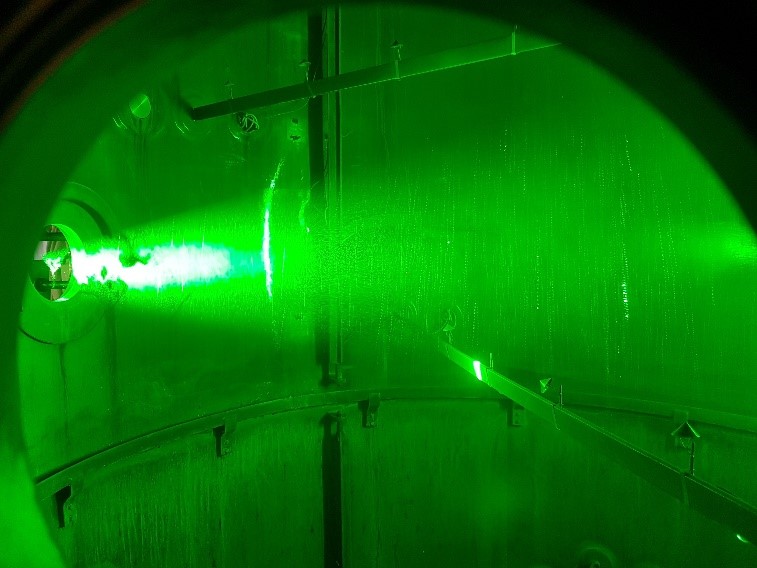 Vue intérieure de la cuve de l'installation TOSQAN durant une expérimentation d'aspersion, avec le laser utilisé pour réaliser les mesures de taille et de vitesse. Source : Emmanuel Porcheron / IRSN