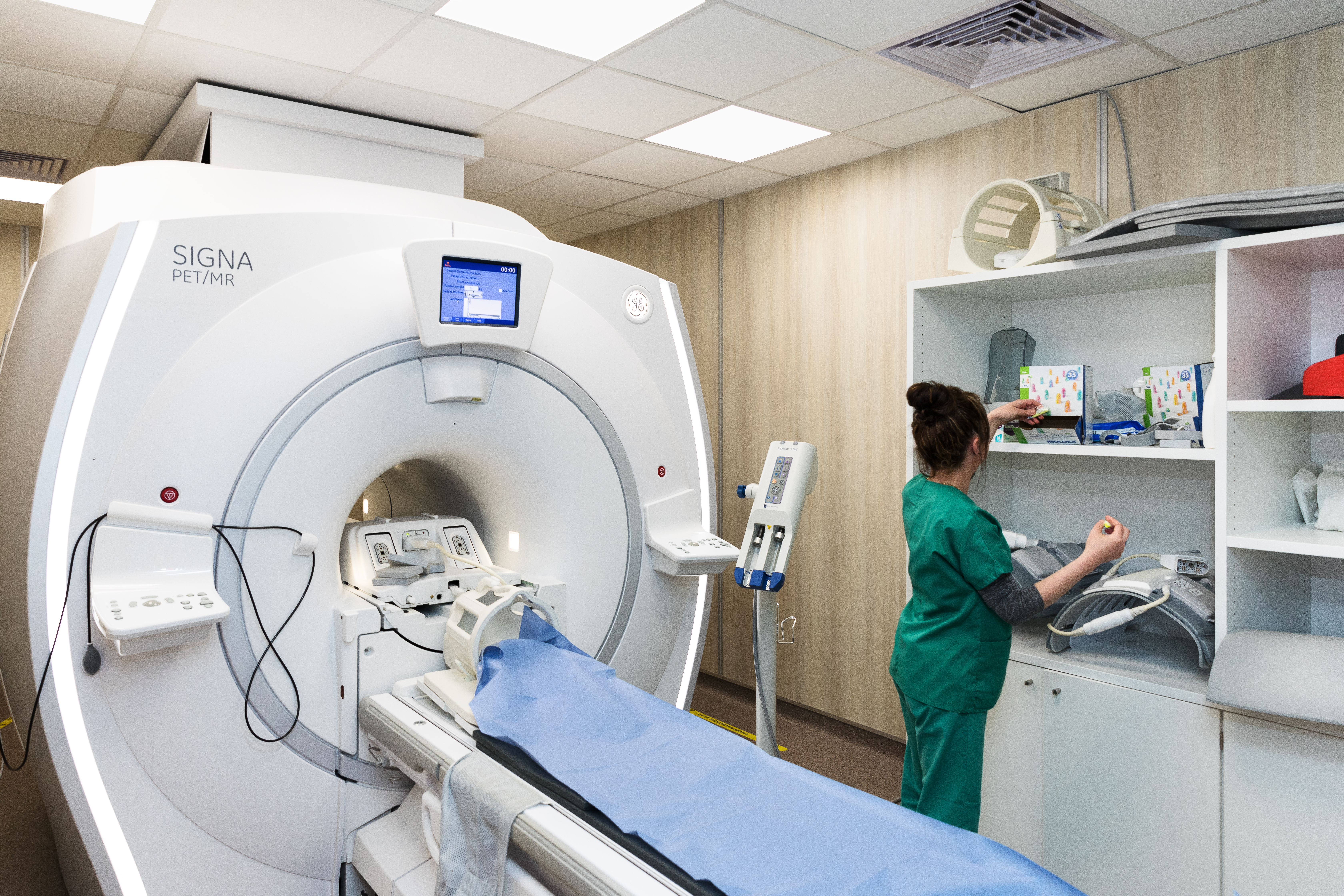 Une praticienne hospitalière prépare le scanner TEP-IRM avant un examen