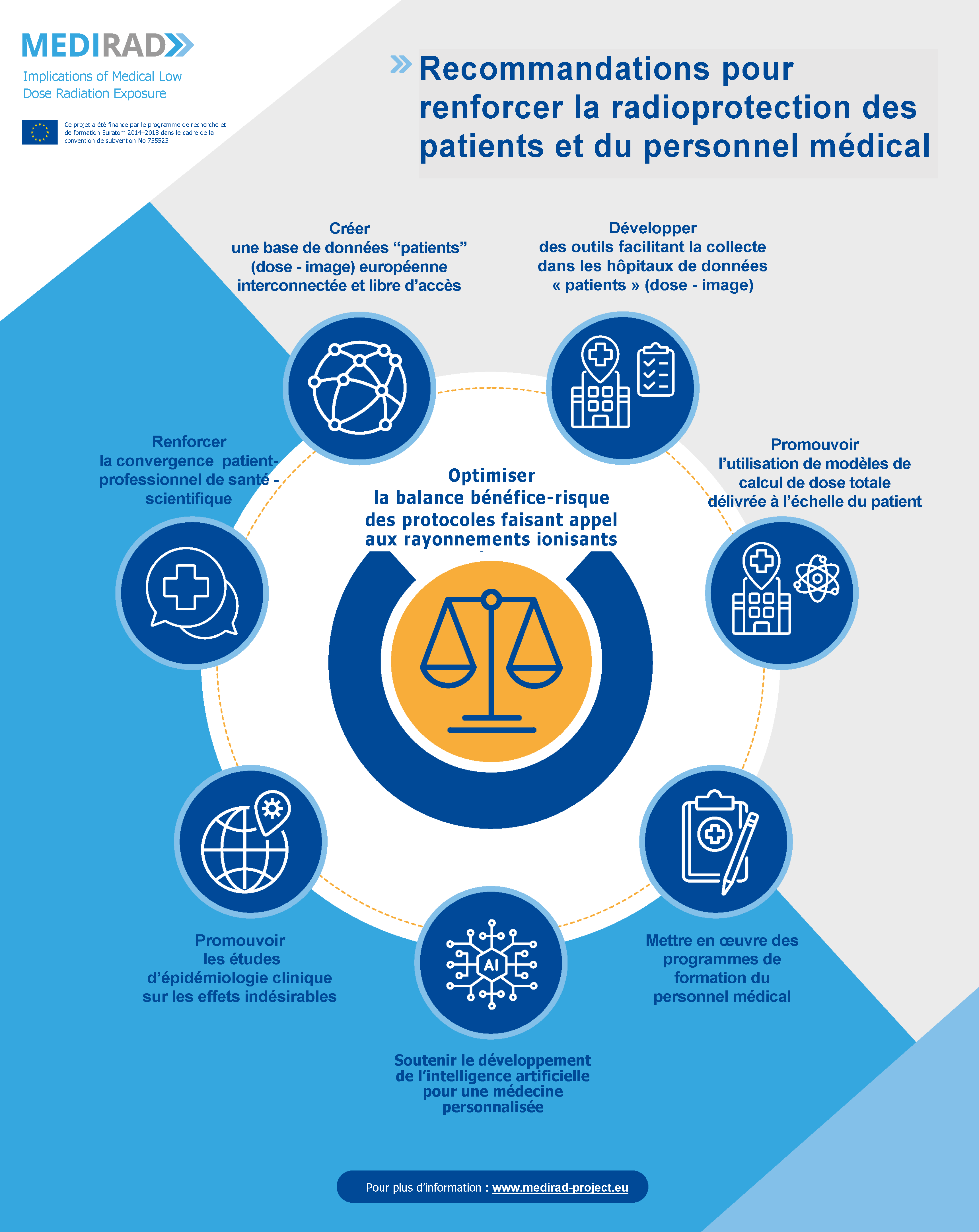 Lancées en 2017, les recherches du projet MEDIRAD (Implication of MEDedIcal low-dose RADiation exposure) ont abouti à une série de recommandations. Elles visent à garantir une meilleure qualité de vie des patients et une meilleure protection des professionnels de santé, dans le cadre d'une utilisation des rayonnements ionisants dans le domaine médical à des fins diagnostique et thérapeutique.