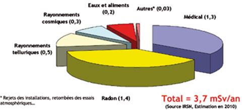 Un Français reçoit au total une dose annuelle moyenne de l’ordre de 3,7 mSv. Cette dose est due à l'exposition à la radioactivité naturelle (radon, rayonnements telluriques, rayonnements cosmiques), à l'exposition médicale et à l'exposition aux radionucléides artificiels.