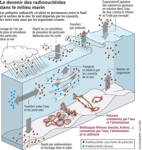 Les océans sont contaminés de façon relativement homogène par les retombées des essais atmosphériques d'armes nucléaires. Les mers peu profondes et les estuaires subissent une contamination plus prononcée du fait des rejets des usines de traitement des combustibles irradiés de Sellafield (Grande-Bretagne) pour la mer d'Irlande et de La Hague (France) pour la Manche. Ces rejets sont en nette diminution depuis plus de 10 ans.