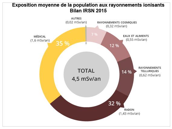 Un Français reçoit au total une dose annuelle moyenne de l’ordre de 4,5 mSv. Cette dose est due à l'exposition à la radioactivité naturelle (radon, rayonnements telluriques, rayonnements cosmiques), à l'exposition médicale et à l'exposition aux radionucléides artificiels.