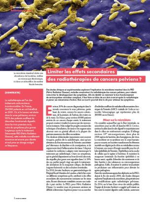 Des études cliniques et expérimentales explorent l’implication du microbiote intestinal dans la PRD (Pelvic Radiation Disease), maladie consécutive à la radiothérapie des cancers pelviens, pour ralentir voire éviter le développement des symptômes. Afin de rétablir ou maintenir le bon fonctionnement de cet écosystème microbien complexe, il faut faire un bilan de son état avant et après la radiothérapie et percer ses mécanismes d’action. Bien se nourrir pourrait être la clé pour atténuer les symptômes.