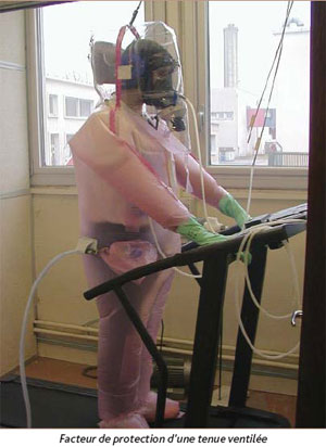 - Essais de vêtements ventilés de protection contre la contamination radioactive sous forme de particules (norme EN 1073-1). Paramètres étudiés :