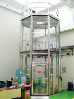 L’installation DISCO permet d’étudier expérimentalement les sources de contamination dues à la mise en suspension de particules lors de chute d’une poudre, d’un objet contaminé ou de pastilles frittées. Cette installation, constituée d’une enceinte d’une hauteur de 5,5 m et d’un diamètre de 3 m, est notamment équipée de systèmes permettant de faire chuter une masse de poudre depuis une hauteur variable (1 à 5 m) et de déterminer la fraction des particules mises en suspension.