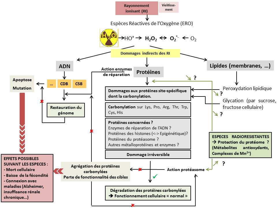 L’approche conventionnelle adoptée dans les études sur les effets biologiques des rayonnements ionisants considère l’ADN nucléaire comme la cible critique des dommages radio-induits (UNSCEAR, 2012). Ainsi, jusqu’à récemment, la majorité des travaux effectués dans ce domaine concernent les dommages à l’ADN et leur réparation. Or des études expérimentales (Daly et al., 2010; Krisko and Radman, 2010; Krisko et al., 2012) ont montré que les protéines, plus que l'ADN, seraient les cibles critiques des dommages causés par l'irradiation des cellules pour de nombreux modèles biologiques. Ces études démontrent que la survie de nombreux organismes est liée au niveau de dommages oxydatifs aux protéines, limitant la fonctionnalité de celles-ci, y compris l'efficacité des enzymes nécessaires pour réparer et répliquer l'ADN. La carbonylation des protéines est irréversible. Les protéines endommagées peuvent cependant être éliminées par la cellule tant que le processus de dégradation des protéines endommagées (complexes protéiques) est suffisamment actif (figure 1). À forte dose d’irradiation (i.e. 200-1000 Gy), dans certains cas, il existe une corrélation entre la production de protéines carbonylées et une baisse de la fécondité (e.g., chez des invertébrés, baisse du taux d'éclosion des œufs pondus et donc du succès reproducteur) voire la mortalité. À faible dose (< 0.1Gy), cependant, la carbonylation des protéines est un marqueur peu étudié.