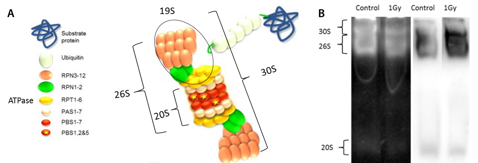 Figure 4 : A/ Schéma du protéasome et de ses sous-unités constitutives (Papaevgeniou and Chondrogianni., 2014 The ubiquitin proteasome system in C .elegans and its regulation). Unités 26S et 30S : ATP et ubiquitine dépendantes ; unité 20S : ATP et Ubiquitine indépendante. B/ Mesure sur gel natif, après séparation électrophorétique, de l’activité des protéasomes 30S, 26S et 20S (panel de gauche) et niveaux d’expression des protéasomes 30S 26S et 20S par Westernblot (panel de droite). Pour chaque ensemble d’images, à gauche : Signal issu des nématodes témoins (définis comme 100% d’activité) et à droite : signal issus des nématodes exposés à 1Gy d’irradiation aiguë (Dubois et al, Sci. Rep. 2018). © IRSN