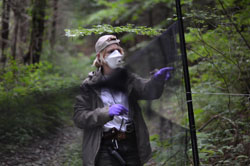 Jean-Marc Bonzom fait une trouée dans la forêt pour pouvoir installer un filet japonais. © Audrey Sternalski/IRSN