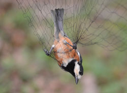 Une mésange prise dans un filet japonais. Après l'avoir démaillée du filet et mesurée, elle fut relâchée ! © Jean-Marc Bonzom/IRSN
