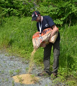 Avant de capturer les moineaux, nous commençons par les attirer en disposant sur le sol des graines. Nous avons achetés 80 Kg de graines pour les répartir sur une dizaine de sites. Et ça marche ! Il est important de déposer beaucoup de graines en une seule fois, car si les moineaux sont présents en nombre, en quelques jours, ils ont vite fait de tout manger. Dès qu’un individu trouve un site de nourriture, ses congénères le rejoignent. Par effet boule de neige, la population grossit. Par la suite, nous disposons des filets judicieusement placés en prenant en compte leurs trajectoires de déplacement.