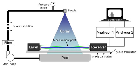 Ce banc expérimental a été mis en service en 2010 dans le cadre de la thèse d'Arnaud Foissac pour étudier les interactions entre les gouttes des sprays issus de buses d’aspersion, telles que celles utilisées dans les réacteurs nucléaires en cas d’accident de fusion du cœur.