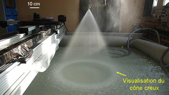 L’autre effet de l’aspersion étudié sur le banc Calist est l’entraînement des gaz par les sprays. Ce phénomène a été étudié dans l’enceinte Tosqan avec des buses de petite taille, et l’installation Calist permet de s’intéresser en détail à l’entraînement des gaz pour des buses de taille « réelle » (buses de REP dont on peut voir un spray dit en forme de « cône creux », sur la figure 3).