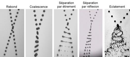 Figure 4. Étude de l'issue de la collision de gouttes : différents régimes sont observés selon les tailles et vitesses de gouttes et conditions d'impact (nombre de Weber et paramètre d'impact).