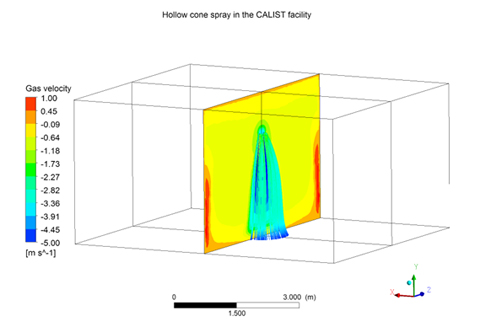 En effet, la dynamique de brassage de l’air entraîné par un spray est un phénomène délicat à modéliser, notamment aux échelles considérées ; d’une part une partie des échanges a lieu dans la zone d’atomisation du jet liquide, d’autre part la densité de gouttes dans la zone de formation du spray est importante (voir sur la figure 6 une prise de vue de la zone d’atomisation des gouttes). Ceci engendre un fort couplage rétroactif entre les gouttes et le gaz dans lequel la turbulence joue également un rôle. Des essais dans Calist font actuellement l’objet d’un benchmark dans le cadre du réseau d’excellence Sarnet-2 sur les accidents graves (voir un exemple de calculs CFD dans Calist, figure 7).