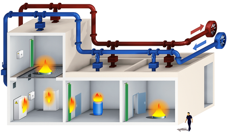 - Propagation de fumée entre les différents locaux (portes, vannes, ouvertures au sol, etc.) et impact sur l’installation et ses équipements