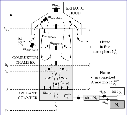Le dispositif CADUCEE (Controlled Atmosphere Device for Unburnt and Carbon Emission Evaluation) permet de réaliser des feux en atmosphère contrôlée à faible teneur en oxygène et sous un flux de chaleur additionnel externe incident et contrôlé afin de quantifier l'influence de ces deux paramètres contrôlés sur les principaux paramètres de combustion (taux de pyrolyse, puissance du feu, rayonnement, température de flamme) pour différents types de combustibles. L'objectif final est de construire des corrélations à utiliser dans les modèles d'incendie.