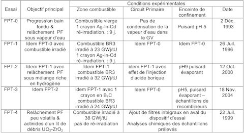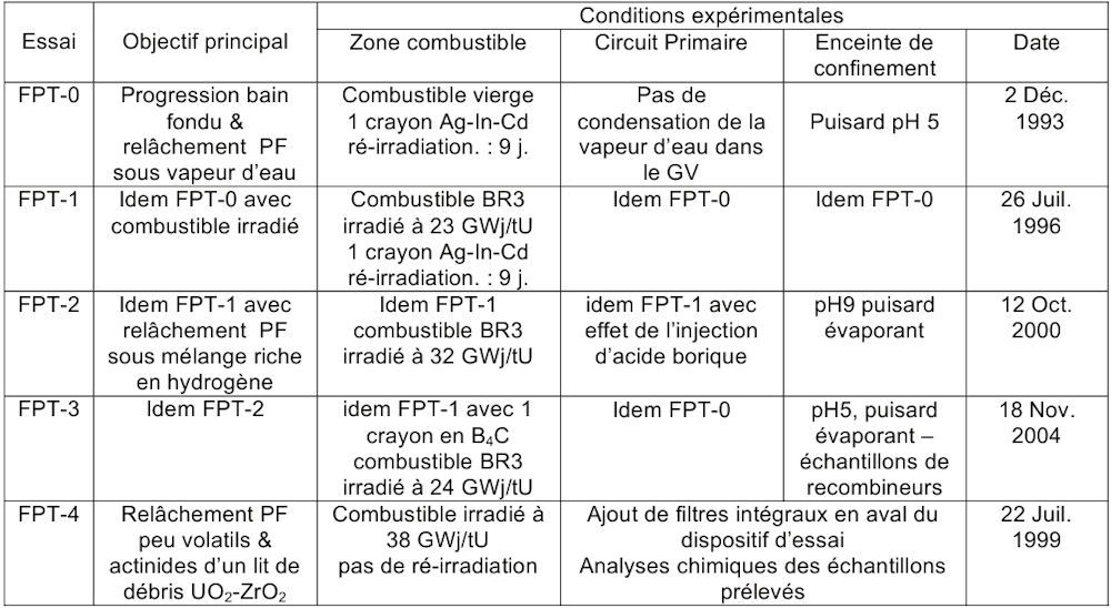 Les trois premiers essais (FPT-0 en 1993, FPT-1 en 1996 et FPT-2 en 2000) ont permis d’étudier l’effet du taux d’irradiation et de l’environnement (oxydant ou réducteur) sur la dégradation du combustible, le relâchement et le transport des produits de fission ainsi que leur comportement dans l’enceinte de confinement. Ces trois essais ont été réalisés avec une barre de commande en alliage Ag-In-Cd représentative des REP de type Westinghouse (900 MWe) dont il a été montré l’influence sur le comportement des produits de fission.