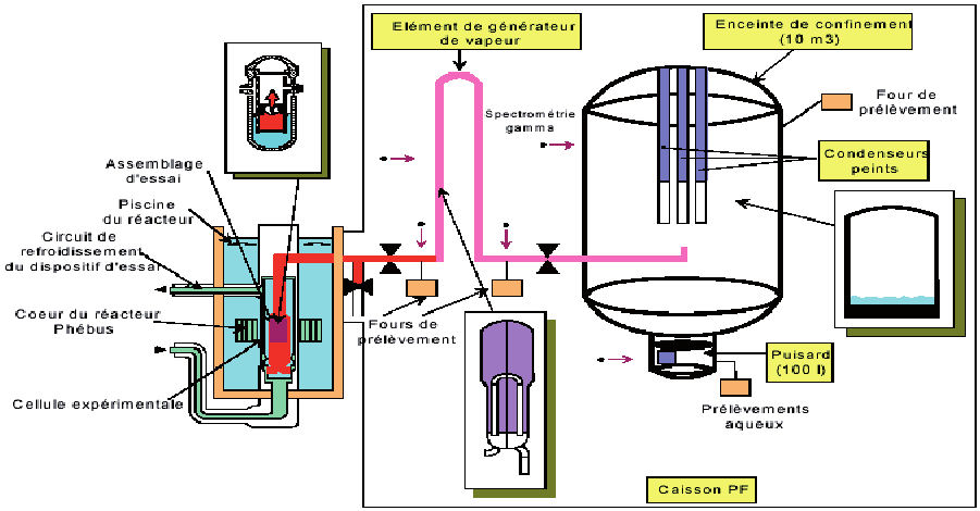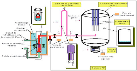 • le réacteur Phébus, de type piscine, d’une puissance de 40 MW, utilisé pour fournir le flux de neutrons destiné à chauffer le combustible d’essai par fissions ;
