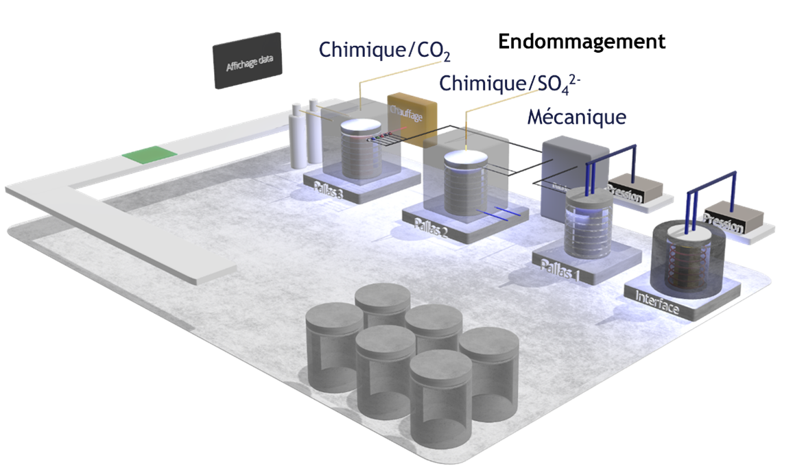 Le colis est exposé à un endommagement de source chimique (CO2) et thermique pour évaluer la capacité du dispositif de surveillance à détecter une élévation anormale de température au cœur du colis et la genèse puis l’évolution d’une fissuration résultant de la carbonatation en température.