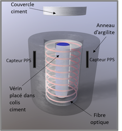 Partenaires impliqués : IRSN (dimensionnement, lancement et suivi des essais expérimentaux), UGE (fibres optiques), SOCOTEC Monitoring (jauges de déformation), AUGLANS (fabrication des colis de taille réelle).