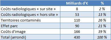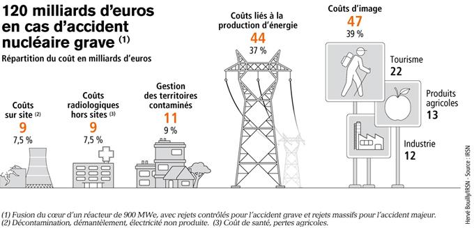 Selon les évaluations réalisées par l’IRSN, un accident grave représentatif engendrerait un coût global de quelque 120 milliards d'euros (avec une fourchette entre 50 et 240 milliards d'euros).