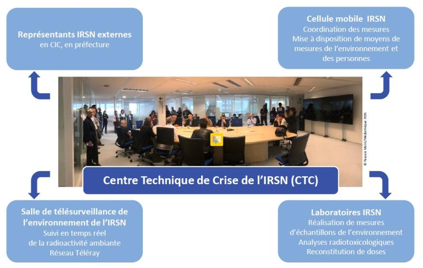 Centre névralgique de l’organisation de crise de l’IRSN, il s’organise en cellules thématiques (évaluation de l’installation, calcul des conséquences radiologiques, santé, communication, international, logistique) et comprend des logiciels de calcul développés pour être en mesure d’évaluer rapidement la situation, en particulier les rejets radioactifs réels ou potentiels, la dispersion de la radioactivité dans l’environnement et les doses qui sont ou seraient reçues par la population.