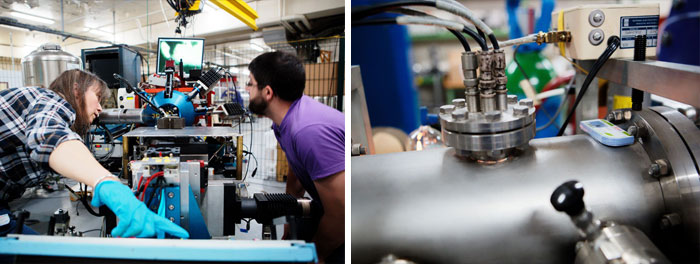 Photo à droite : Pour Aglaé, cinq dosimètres d’ambiance sont posés à la sortie des sources et de la cuve d’accélération, et aussi au niveau de l’aimant orientant le faisceau, de la cage de Faraday et du portail de la zone d’analyse. Un sixième placé dans la salle de commande sert de témoin. Deux PCR assurent le suivi dosimétrique des travailleurs. (© Nicolas Lartigue/Pellicam/IRSN) |