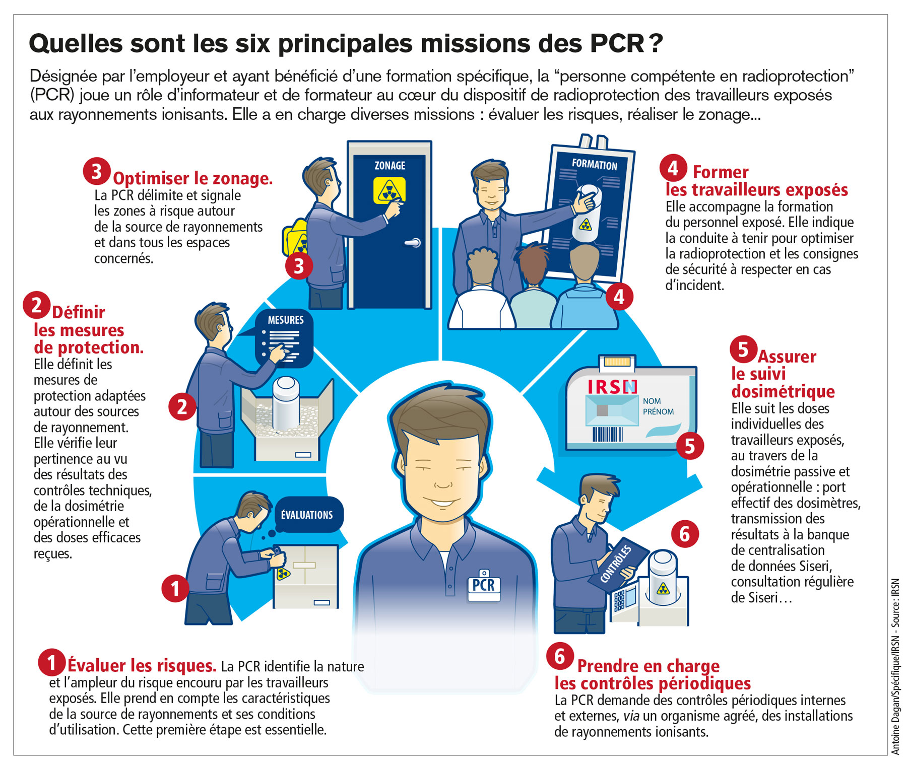 Dans les grands établissements hospitaliers, ce sont souvent des PCR à temps plein qui s'assurent de la radioprotection des travailleurs. Elles réalisent les études de poste - l'évaluation de la dose efficace à laquelle sera soumis un travailleur durant une année. Elles optimisent le zonage en évaluant les risques spécifiques de chaque salle. Elles suivent les doses individuelles des travailleurs. Elles sonnent l'alerte en cas de trop forte dose.