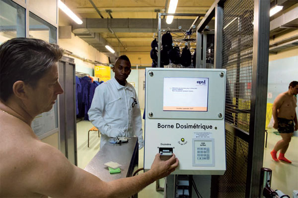 La surveillance quotidienne de la dose reçue par les travailleurs est sa priorité. Il renseigne les Dossiers d’intervention en milieu radiologique/radioactif (DIMR). Ces documents décrivent les phases du chantier, les moyens de prévention, la dose prévisionnelle et la durée d’intervention pour chaque technicien. Ces données seront confrontées jour après jour aux doses réellement mesurées. Jean-Claude Sotiaux garde un œil sur une centaine de dosimètres passifs – pour la surveillance de l’environnement – et sur les portiques de contrôle à l’entrée et à la sortie des ateliers, des vestiaires, et du site lui-même. Il accompagne parfois les équipes, comme bientôt en Chine, pour superviser la décontamination d’un équipement. |