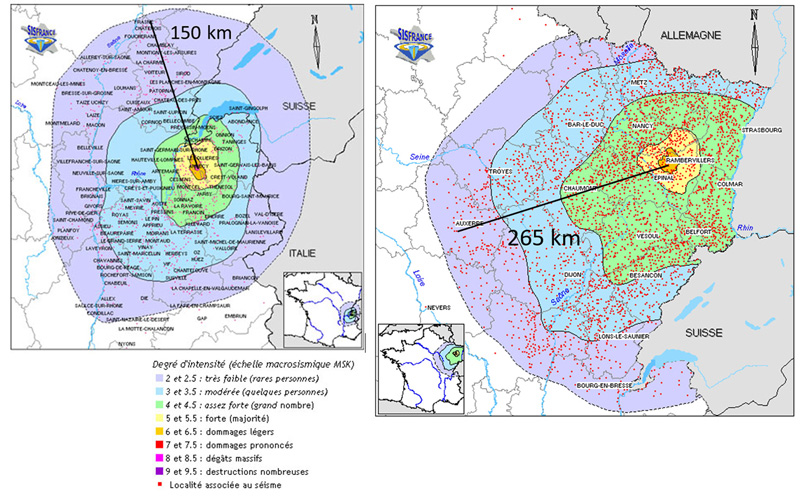 La figure illustre aussi la différence entre Magnitude et Intensité par la comparaison des effets en surface des séismes d’Annecy-Epagny (1996) et de Rambervilliers (2003). Ces deux séismes ont des magnitudes voisines (Mw=4,9) mais la répartition des intensités est différente. Dans le cas du séisme de Rambervilliers, la zone dans laquelle le séisme a été ressenti est beaucoup plus grande que dans le cas du séisme d’Annecy-Epagny. Il est à noter que ces deux séismes ont des profondeurs très différentes (3 km pour le séisme d’Annecy-Epagny et 20 km pour le séisme de Rambervilliers). Les estimations des magnitudes et des profondeurs mentionnées ici sont extraites du catalogue Si-Hex v2.