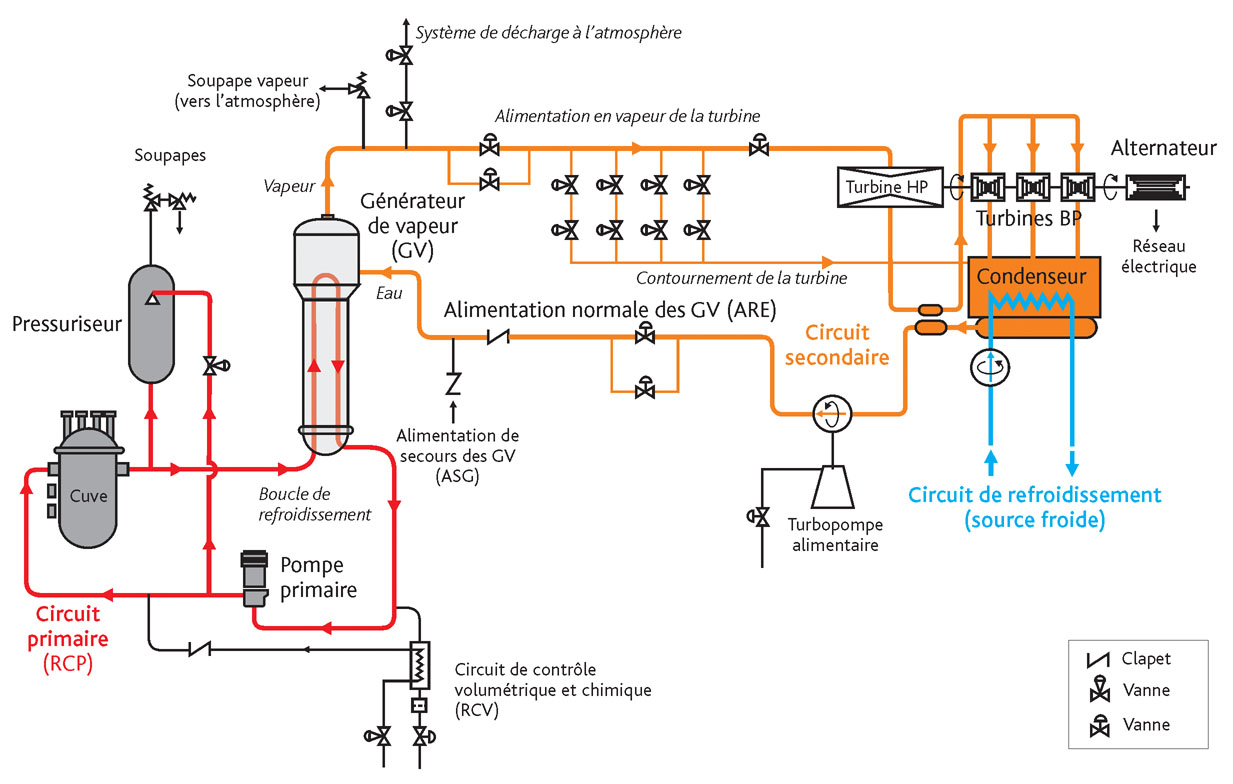 Les circuits secondaires (cf. circuit orange dans le schéma ci-dessus) sont utilisés pour convertir l’énergie thermique produite par le cœur en énergie électrique.