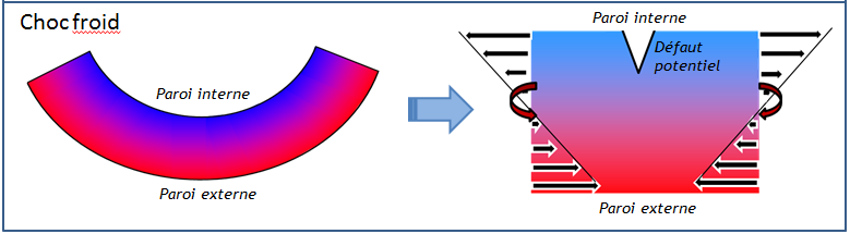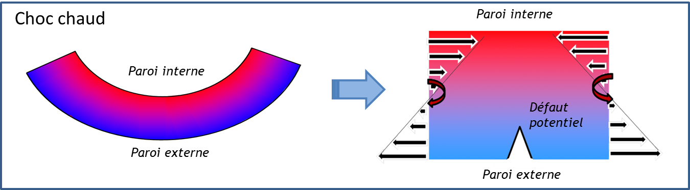 - en cas du choc chaud, les contraintes thermiques en paroi externe tendent à ouvrir le défaut potentiel situé en paroi externe. Pour ce type de sollicitation, un défaut potentiel situé en peau interne ne peut s’ouvrir car les contraintes tendent à le refermer ;