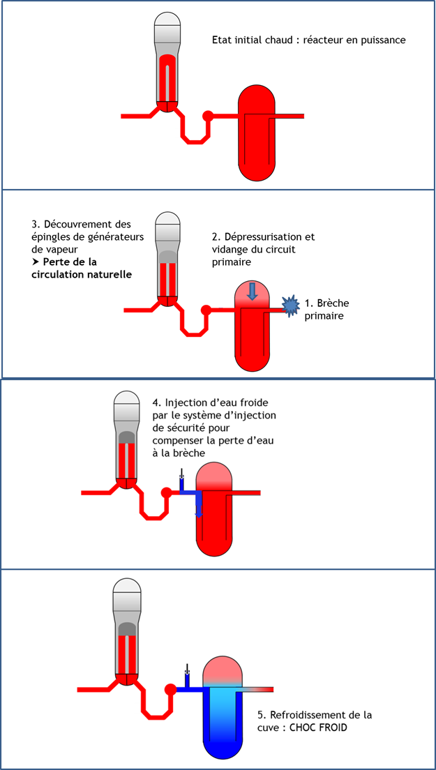 À titre d’illustration, le schéma ci-dessous présente le cas d’une brèche sur le circuit primaire étudiée par Areva NP dans le cadre de ce dossier, qui entraîne un choc froid sur le fond de la cuve.
