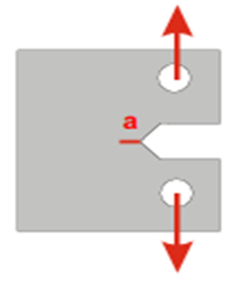 Dans le schéma ci-contre, la fissure a est symbolisée par le trait plein rouge. Les flèches vers le haut et vers le bas représentent les forces à l’œuvre sur l’éprouvette. |