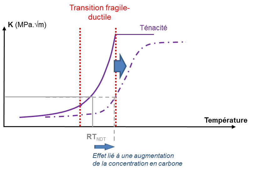 Typiquement, il est constaté une fragilisation de l’acier dans les zones à forte concentration en carbone, se traduisant par une diminution de la ténacité et par une augmentation de la température de transition dénommée « RTndt », entre les comportements fragile et ductile du matériau (la ductilité d’un matériau désigne sa capacité à s’étirer, se déformer avant de rompre ; à l’inverse, un matériau fragile va casser et se rompre rapidement).