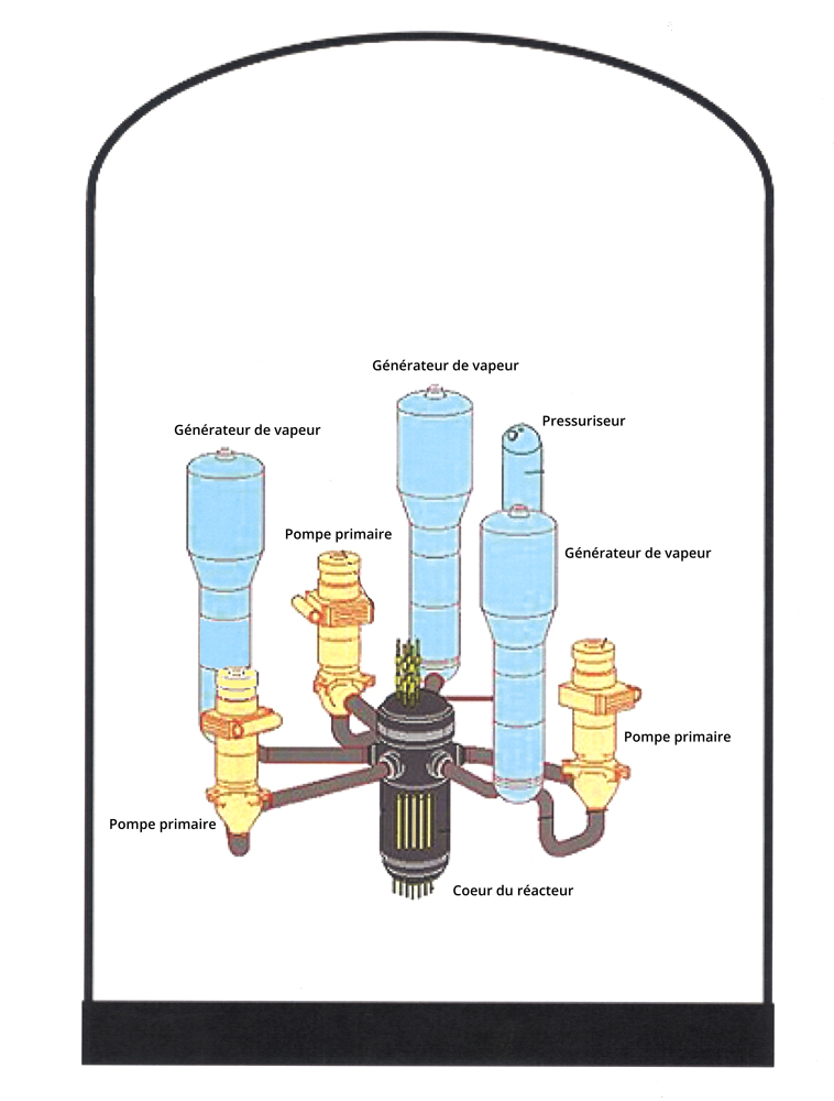 Le circuit primaire et les générateurs de vapeur sont implantés à l'intérieur d'une enceinte de confinement qui est traversée par les tuyauteries d'alimentation en eau et d'évacuation de la vapeur des générateurs de vapeur. Une telle disposition permet d'éviter un transfert d'eau du circuit primaire à l'extérieur de l'enceinte de confinement tant que l'étanchéité des tubes des générateurs de vapeur est assurée.