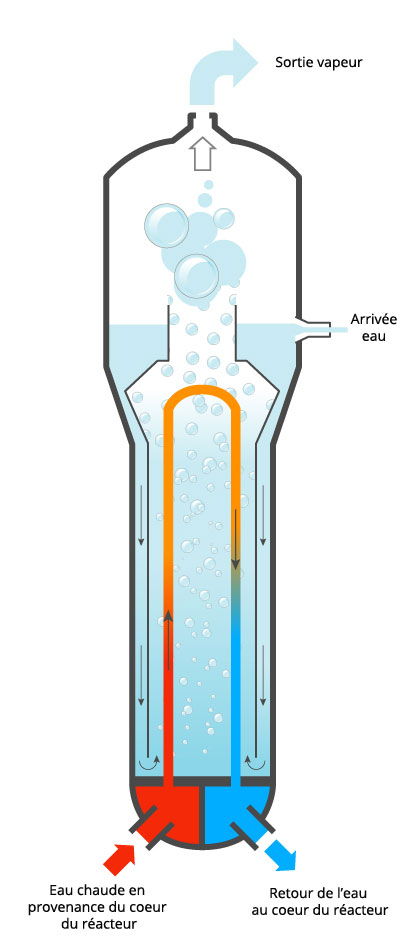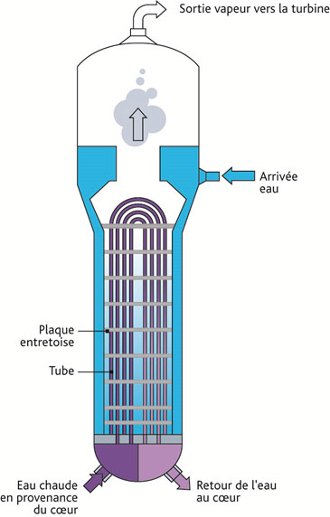 L'échange thermique entre le circuit primaire et le circuit secondaire se fait au travers d'un grand nombre de tubes en U inversé regroupés dans des appareils dénommés Générateurs de Vapeur (GV). Dans les centrales françaises, il y a trois ou quatre générateurs de vapeur selon la puissance du réacteur.