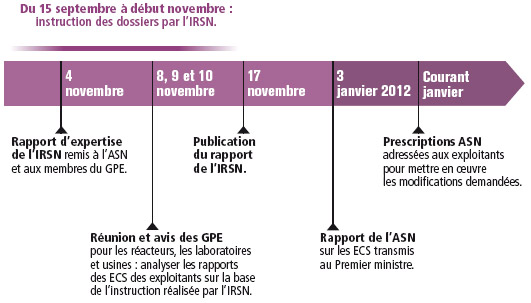 Soixante-dix-neuf installations jugées prioritaires par l’ASN ont fait l’objet de rapports remis par les exploitants dès septembre 2011. Pour les autres installations, les exploitants ont disposé d’une année supplémentaire. La quasi-totalité des installations françaises ont donc été concernées : les 58 réacteurs à eau sous pression, l’EPR en construction, les installations de recherche et les usines du cycle du combustible.
