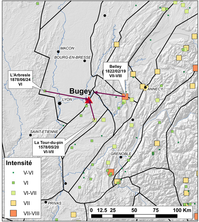 La figure 2 montre un exemple de ces déplacements (flèches) pour le site nucléaire de Bugey. Le séisme de L’Arbresle (1878) survenu dans la même zone que le site, est déplacé « sous » celui-ci, tandis que les séismes survenus dans une zone voisine sont rapprochés au plus près de limite de zone, ainsi le séisme de la Tour du pin (1578) est rapproché à environ 1,5 km, le séisme de Belley (1822) est rapproché à environ 11 km du site.