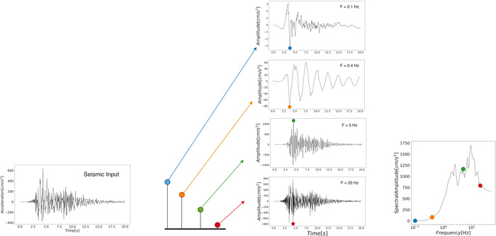Le mouvement du sol peut être décrit sous différentes formes : l’évolution de l’accélération du sol en fonction du temps (dit accélérogramme) ou le « spectre de réponse ». Ce dernier, qui est couramment utilisé, exprime l’accélération maximale (et donc la force) à laquelle est soumise une série de ressorts, chacun caractérisé par une fréquence caractéristique (voir Figure 5). En première approximation, ces ressorts peuvent être assimilés à des bâtiments ou à des équipements.
