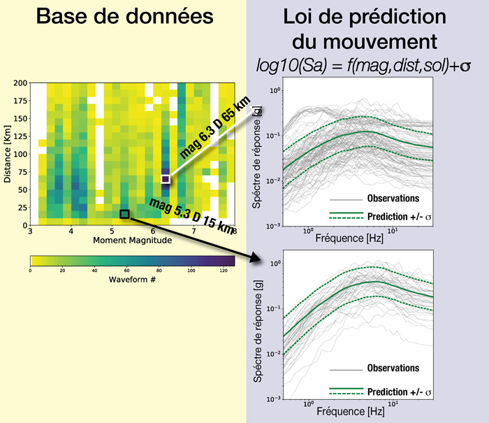 Il est possible d’établir des relations empiriques entre les caractéristiques d’un séisme et son spectre de réponse déterminé en un site donné. Pour ce faire, les sismologues collectent dans des bases de données des enregistrements accélérométriques mesurés lors de séismes ainsi que les spectres de réponses qui en sont issus. Les enregistrements proviennent de réseaux sismologiques déployés à travers le monde, le plus souvent dans des régions sismiquement actives (i.e. Bassin Euro-Méditerranéen, Japon, États-Unis…). Les bases de données mettent à disposition des communautés de sismologues et d’ingénieurs des accélérogrammes mais aussi des informations complémentaires (métadonnées) comme la magnitude, la distance entre séismes et stations d’enregistrement ou les conditions de sol à l’aplomb des stations. À partir de ces bases de données, plusieurs relations empiriques, aussi appelées équations de prédiction du mouvement du sol, sont définies. La RFS 2001-01 préconise l’utilisation de la relation de Berge-Thierry et co-auteurs de 2003, établie à partir d’enregistrements de séismes européens et californiens.