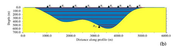 Figure 6 : La présence d’une cuvette sédimentaire (en bleu) encaissée dans un massif rocheux (en jaune) est susceptible de modifier significativement le mouvement sismique incident. Dans ce cas, il est nécessaire de conduire une étude pour tenir compte des spécificités du milieu (IRSN).