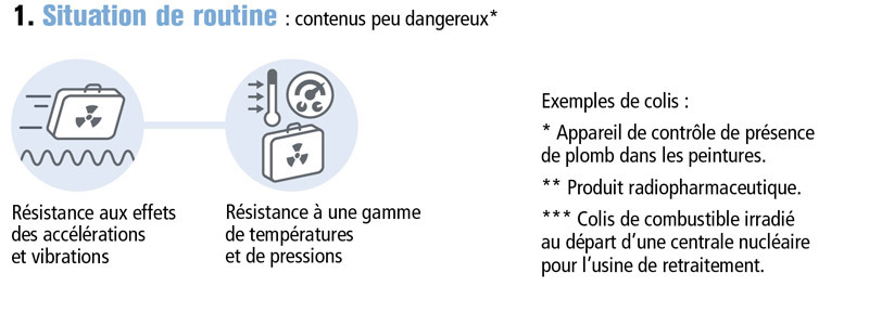 A contrario, compte tenu de la quantité limitée de radioactivité transportée, les colis « exceptés » (460 000 colis par an), ceux de type A (300 000 colis par an) et les colis industriels IP (100 000 colis par an) ne sont pas soumis aux épreuves accidentelles. Ainsi, le seuil de résistance est limité aux situations de routine (vibrations, variations de température, etc.) pour les colis « exceptés » et aux incidents (forte pluie, chute de 1,2 mètre, empilement) pour les colis de type A et IP.