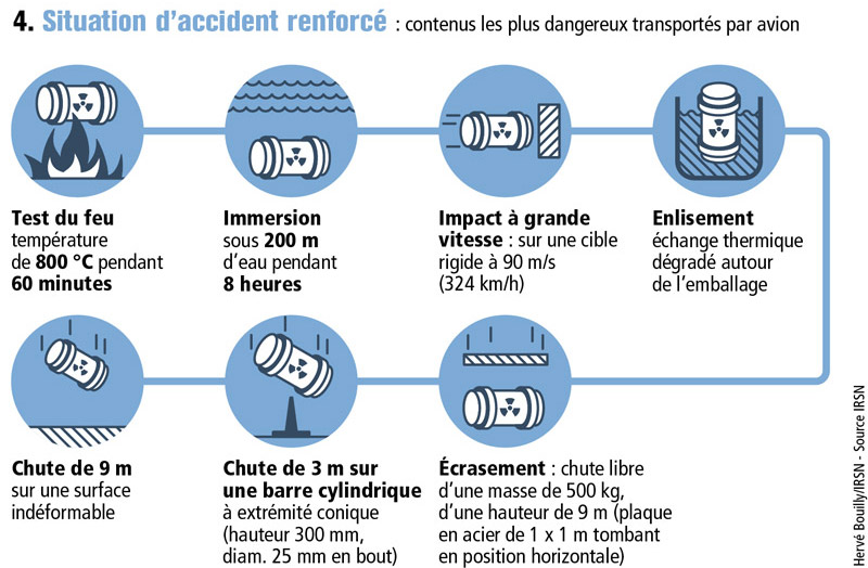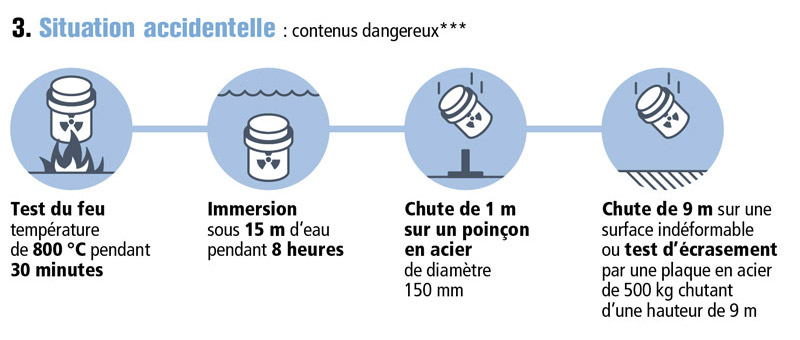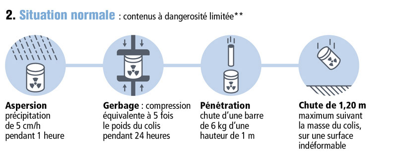 Par exemple, le colis de type B (60 000 colis par an en France) est utilisé pour le transport de substances fortement radioactives, à savoir quand la dose reçue, par irradiation, contamination et inhalation, est de 50 mSv pour une personne située, pendant 30 minutes, à 1 mètre de la matière non emballée. Par ailleurs, le colis de type B doit résister à des situations accidentelles telles qu’un feu de 800° C pendant 30 minutes, une chute de 9 mètres, une perforation avec un poinçon de 1 mètre ou encore une immersion jusqu’à 200 mètres pour les colis les plus radioactifs. Ces essais sont réalisés par les industriels et expertisés par l’IRSN.