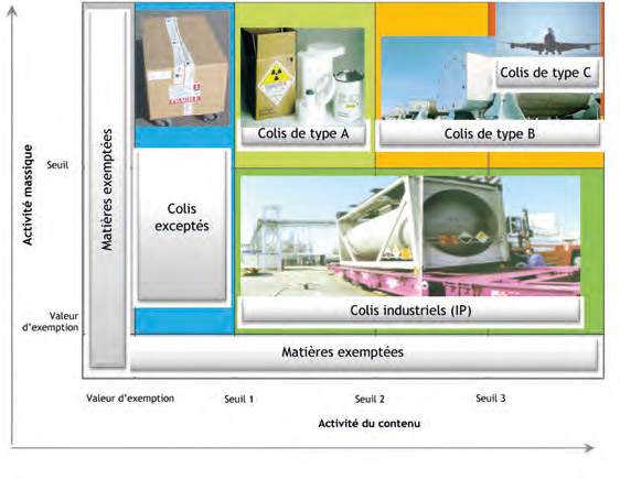 La réglementation distingue plusieurs types de colis en fonction de la quantité de substances radioactives à transporter (l’activité du contenu) et de leur dilution dans l’ensemble des matières à transporter (l’activité massique du contenu). Ces seuils d’activité dépendent des conséquences radiologiques potentielles et de la forme physique de la matière (solide, liquide ou gazeuse).