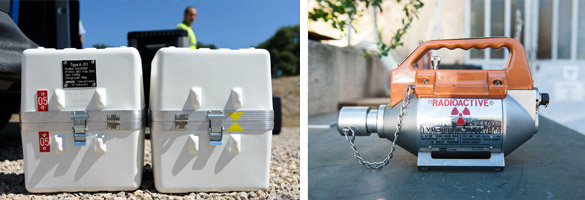 A gauche, emballages étanches appartenant à la classe de colis type A dans lesquels sont conditionnées les piluliers contenant les sources radioactives (© Arnaud Bouissou/MEDDE/IRSN). A droite, appareil destiné à réaliser des contrôles non destructifs par radiographie, les gammagraphes sont régulièrement transportés. Pour ce faire, l’expéditeur utilise un colis de type B (© Nedim Imré/IRSN).