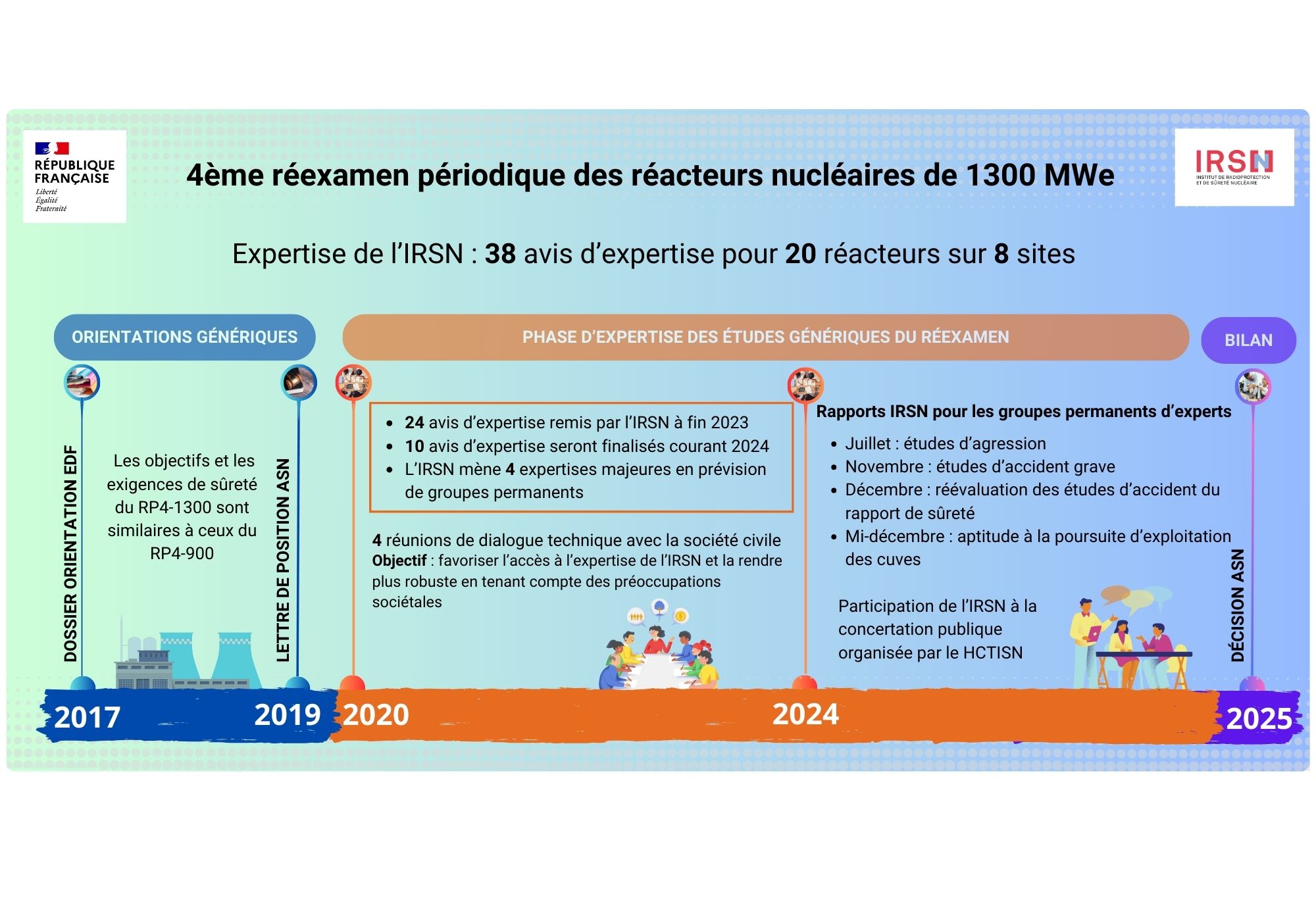 Cette phase de visites décennales est préparée par une phase générique d’expertise des études d’EDF par l’IRSN engagée en 2020 et qui se poursuivra jusqu’au début de l’année 2025, échéance à laquelle l’IRSN devrait être en mesure d’établir un avis de synthèse quant à l’atteinte par EDF des objectifs de sûreté fixés par l’ASN à l’occasion de l’examen du dossier d’orientation du RP4 1300 datant de 2019.